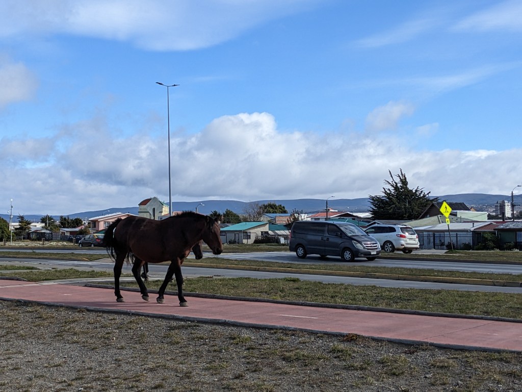 And the dogs. I’ve written about the dogs of Punta Arenas before. They’re still here, wandering, following, waiting for a stritch or a throw of the ball that they bring and drop at your feet, right out there on the promenade. And the…I don’t remember horses. But apparently that’s a thing here, too. Horses, just wandering unattended. No one else seemed surprised, and the horses seemed to know where they were going, so…
