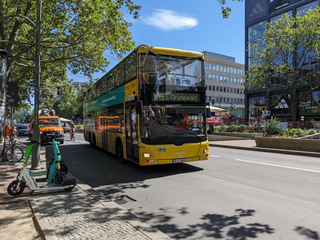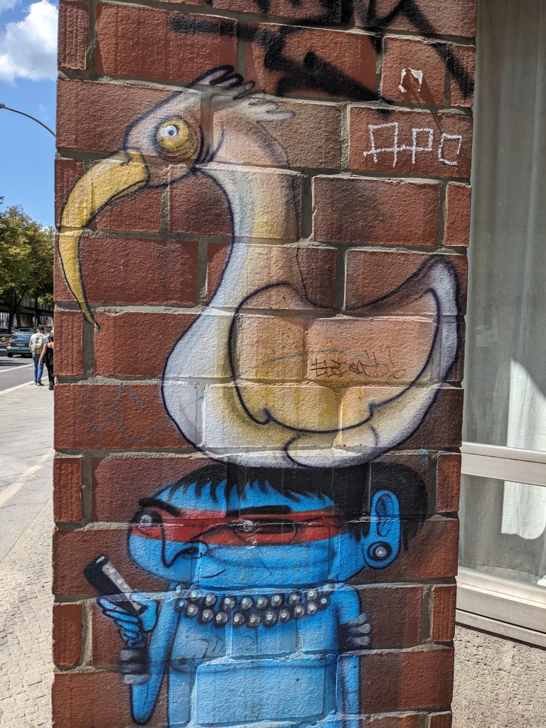 When not on foot, we’ve been indulging in random explorations on the buses. The Berlin public transportation system is frighteningly civilized. Whenever we’ve picked a destination, there has inevitably been a bus stop with a block or two, with a route that will take us within a few minutes walk of where we’re going. And tickets? About $40 gets you a seven day pass on all the buses and trains in the area. Not that in our four days so far there’s been any sign of anyone checking for tickets for anything. A bus pulls up, you step on. When you get to your destination, you push the “Stop” button, thank the driver and step off. Repeat as necessary.
