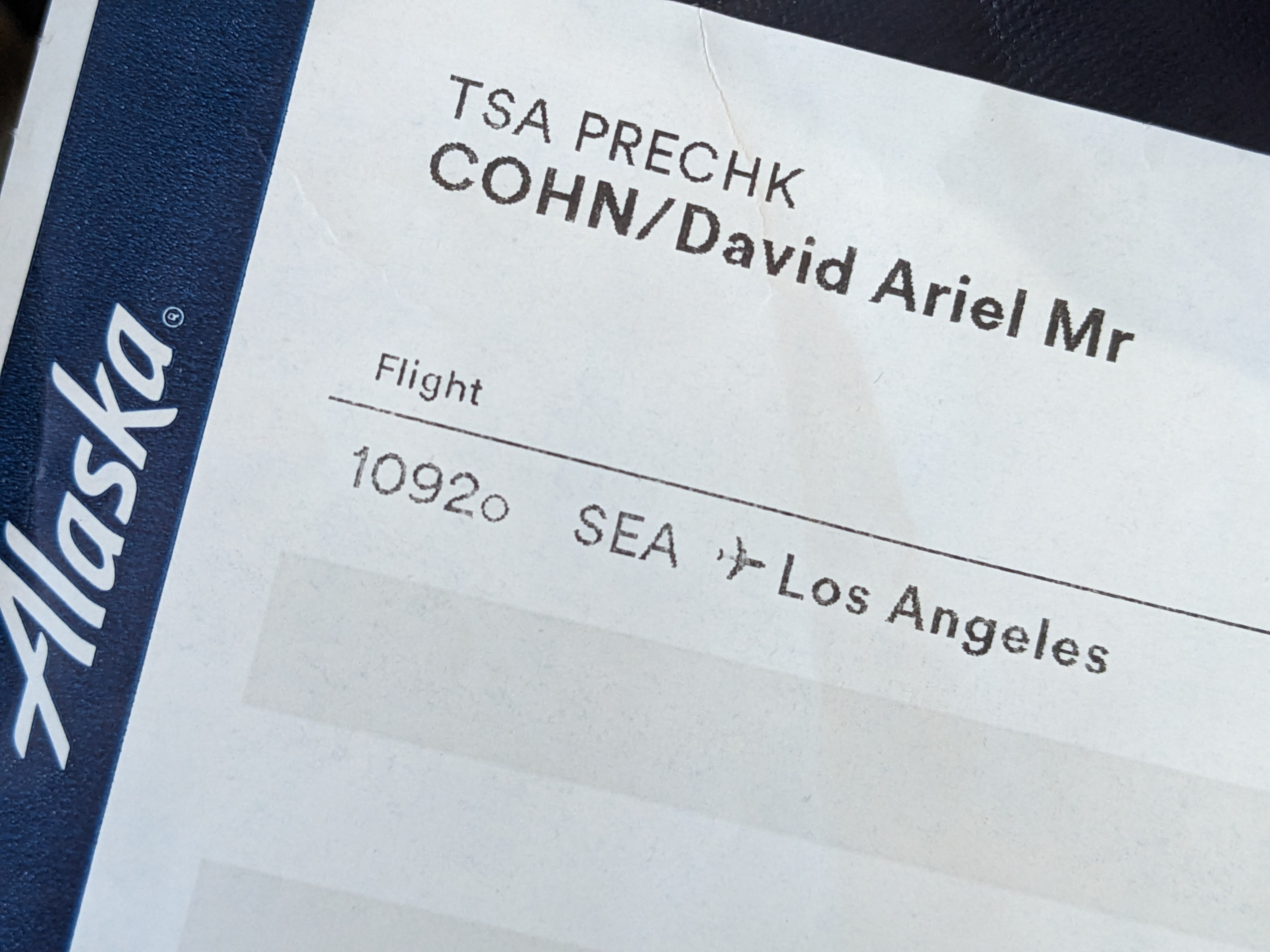 She holds the boarding pass out for me to examine. It read “Mr. David Ariel Cohn” (actually “COHN/David Ariel Mr”) Yes, that’s my name. And the problem is?