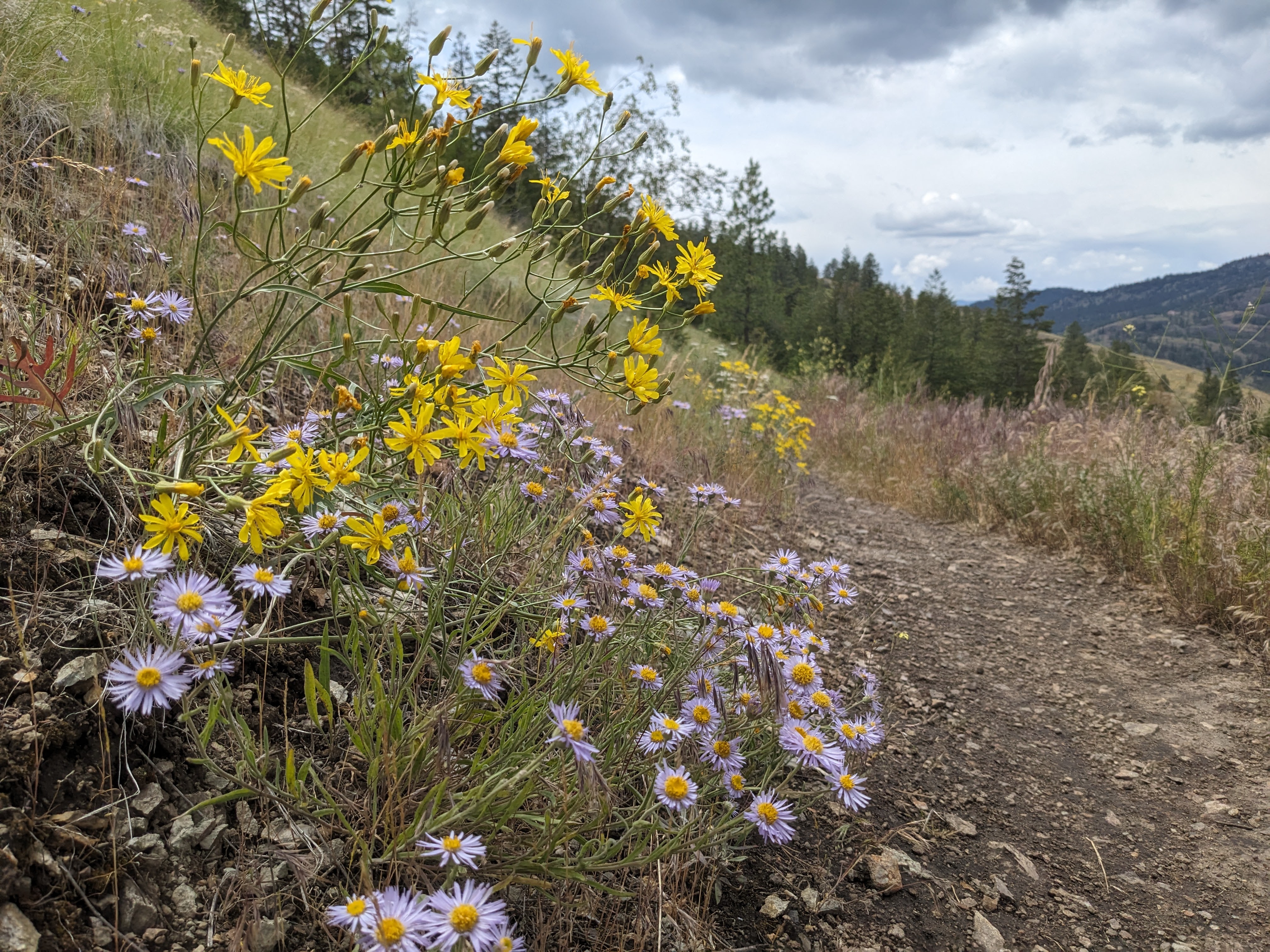 Rain until I stepped out to try a trail called “The Grind” up Giant’s Head in Summerland – mad wildflowers everywhere – then sunshine until I made it back to the car. Osoyoos? Sun, with a bit of wind, until I was back in the car headed for Okanagan Falls. Then down it came until I made it to the campground along the Okanagan River. Cleared up long enough for me to take a lovely dusk stroll along the riverbank.