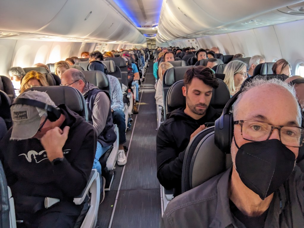 Short story: I made it to the airport. I waved a little plastic card at a glowing box to purchase a delicious-if-a-little-soggy spicy chicken wrap. I held my phone – itself an inconceivable marvel of technology – up for the gate attendant to register, then plonked myself down in a comfy chair aboard a pressurized metal tube that will deliver me, with drinks and in-flight wifi to the entire opposite coast of this country (formerly a perilous five month journey at best) in less time than it would take to watch half a season of Ted Lasso. Which, by the way, is exactly what I am doing rather than working on my slides. I am a leaf on the freakin wind.