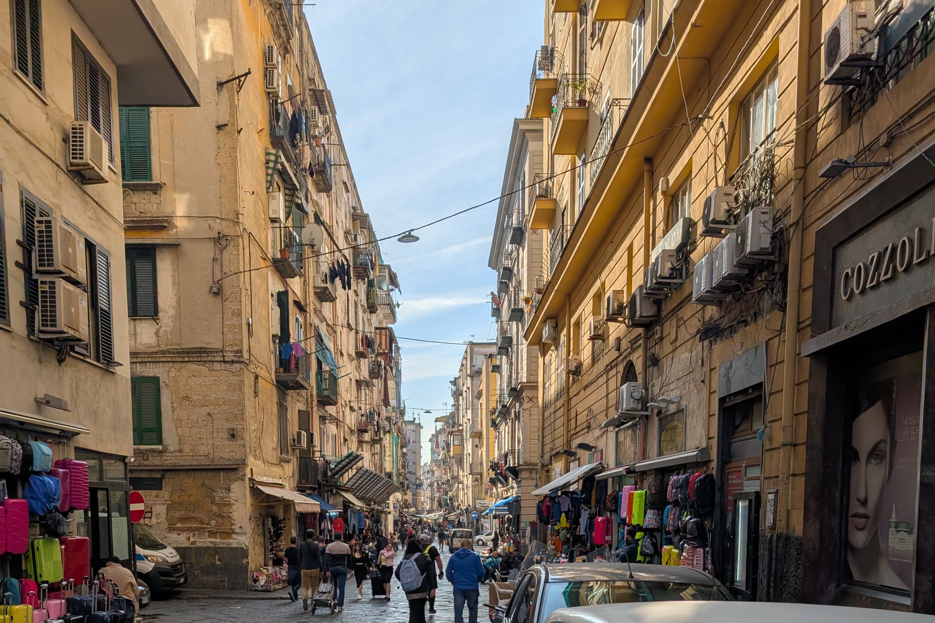 My first impressions of Naples called to mind the feeling of New York’s lower east side from when I was much younger and hadn’t yet developed an allergy for Manhattan’s pretentiousness. Crazy bustle of sidewalk life – families, shopkeepers, neighbors swirling in little eddies around storefronts, chatting excitedly so endearingly that you can almost forgive them for blocking the flow of pedestrian traffic and forcing you out into the certain death of the whizzing street. Except that it wasn’t. Miraculously, small clumps of pedestrians continuously stepped out into traffic to cross and the traffic just flowed around them, like rocks in a stream.