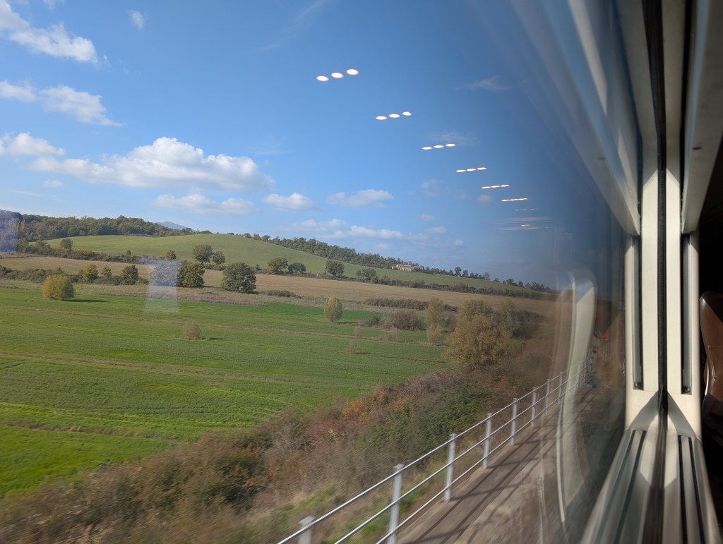 I’m currently northbound on Trenitalia 9628, clocking a smooth, respectable 180 or so miles per hour through the Umbrian countryside. Almost Disney-esque swaths of vineyards whiz by, towns topping the hills like blocky limestone frosting on giant medieval cupcakes. Aqueducts, and silhouettes of ancient, sculpted cedars.