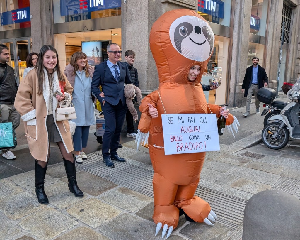 Now, how does that answer change if he is in the entourage of – and probably also father of – a young woman promenading down the street in an inflatable sloth costume and wearing a sight that says “Se mi fai gli auguri ballo come un bradipo!”? (Or approximately, “If you wish me congratulations, I will dance like a sloth!”)