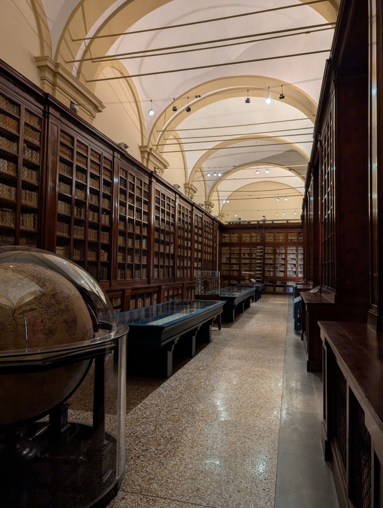 The museum: I’d mentioned a museum that Jim and Ducky insisted I visit, and I was not disappointed. Not hard for science geeks to recognize what will appeal to other science geeks. The Museo di Palazzo Poggi is hidden upstairs in one of the university buildings – I walked past it twice before having to ask. Once I did find it, I got pleasantly lost in one of the many exhibits: a collection of woodcut plates created and/or commissioned by Ulisse Androvandi, a 16th century naturalist who traveled the world while young, cataloging and illustrating “curiosities.” When his age no longer allowed travel, he corresponded with scholars studying the Old and New Worlds, bartering for specimens and creating one of the greatest collections of the age. He was also – according to the museum, at least – was the first to conclude that the best way to convey information about biological specimens was through detailed color illustrations, and commissioned an enormous number of woodcut blocks so that those illustrations could be easily reproduced and distributed. He was also apparently a stickler for detail and rejected illustrations that were “stylistic” at the expense of accuracy. One of the museum’s projects is digitizing 3D models of the original blocks, so as to digitally undo the 500 years of warping and degradation.