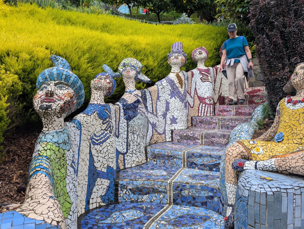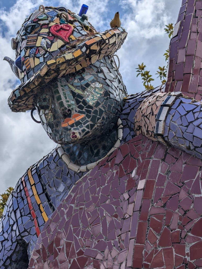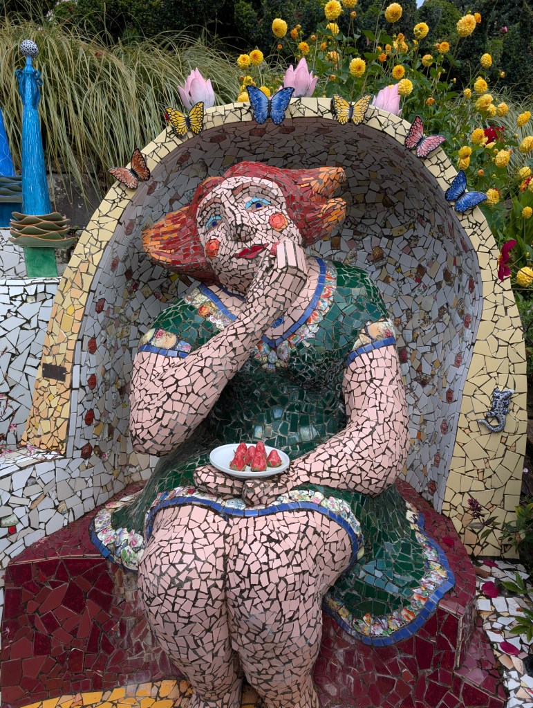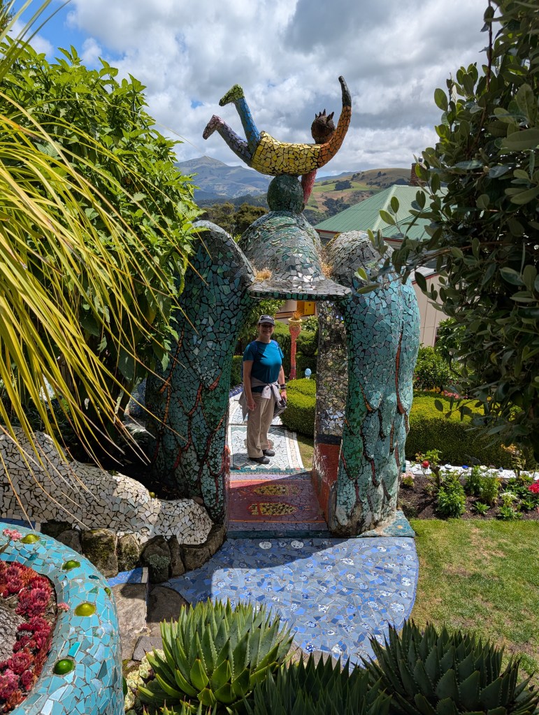 What’s the Giant’s House? We weren’t quite sure, either. You know how there are so many towns that have their equivalent of Wall Drug? A place you’ve got to see, just because it’s the place people go to see when they visit that town? You know – “World’s Largest Corn Dog,” or the like? Well, apparently Akaroa’s main draw (aside from the gorgeous, lush hill walks and quaint French stylings) is something I’d never heard of before: The Giant’s House. Pitched as a whimsical sculpture garden surrounding a twee little Victorian up on the hill.