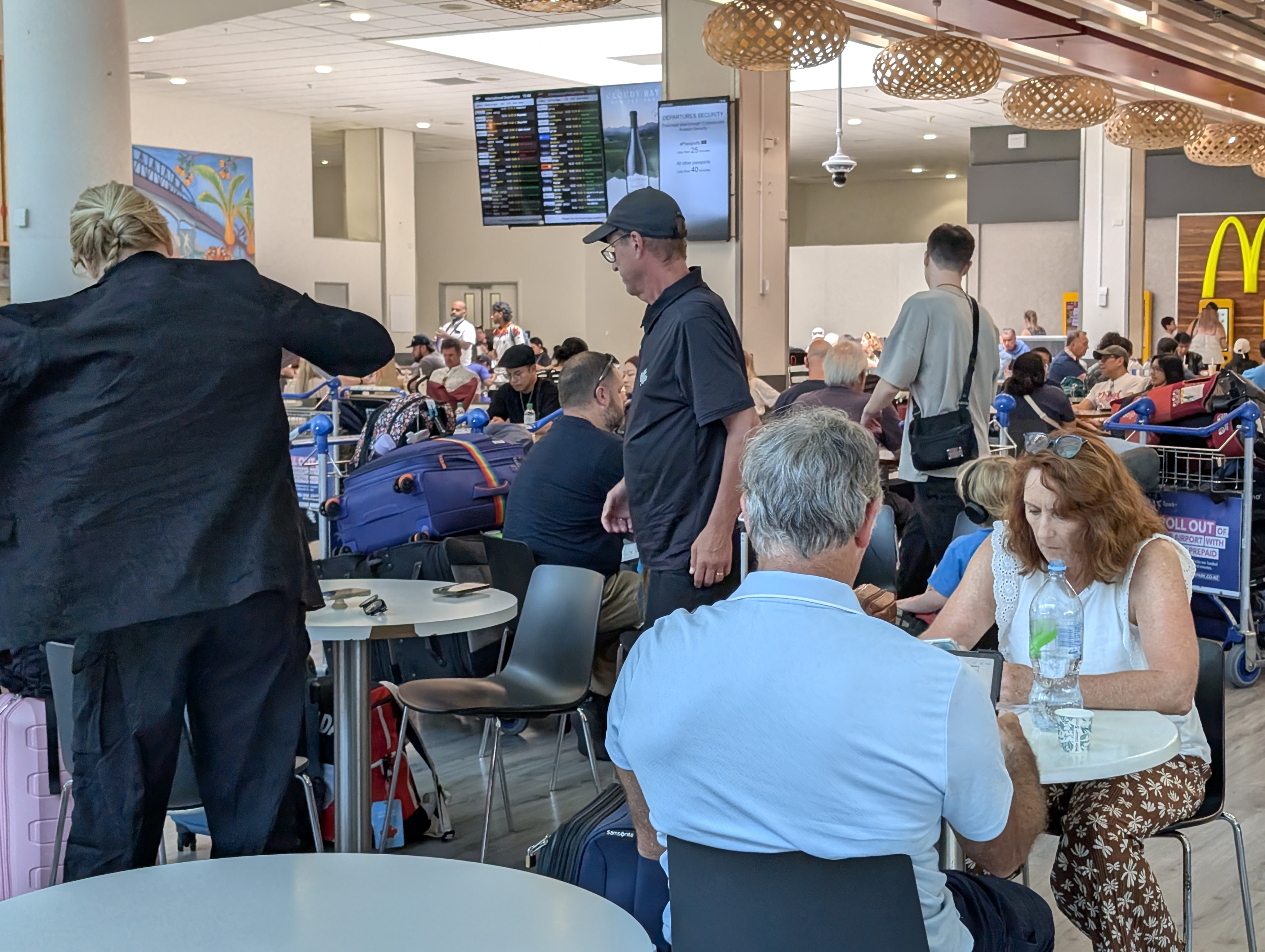 Good’ish news: after sitting, waiting four hours for any update, we decided to approach the service counter for a third time. They at first booked us on the morning flight on Tuesday, but after a bit of fluttering of eyelashes and words of appreciation, we got them to look at other options. We’re now booked to fly out to Sydney tonight. They’ll pay for the airport hotel, then fly us on to Hobart tomorrow morning. And I am absolutely certain that us being cheerful and appreciative of all the cranky people they’re having to face got them to pull a string or two.