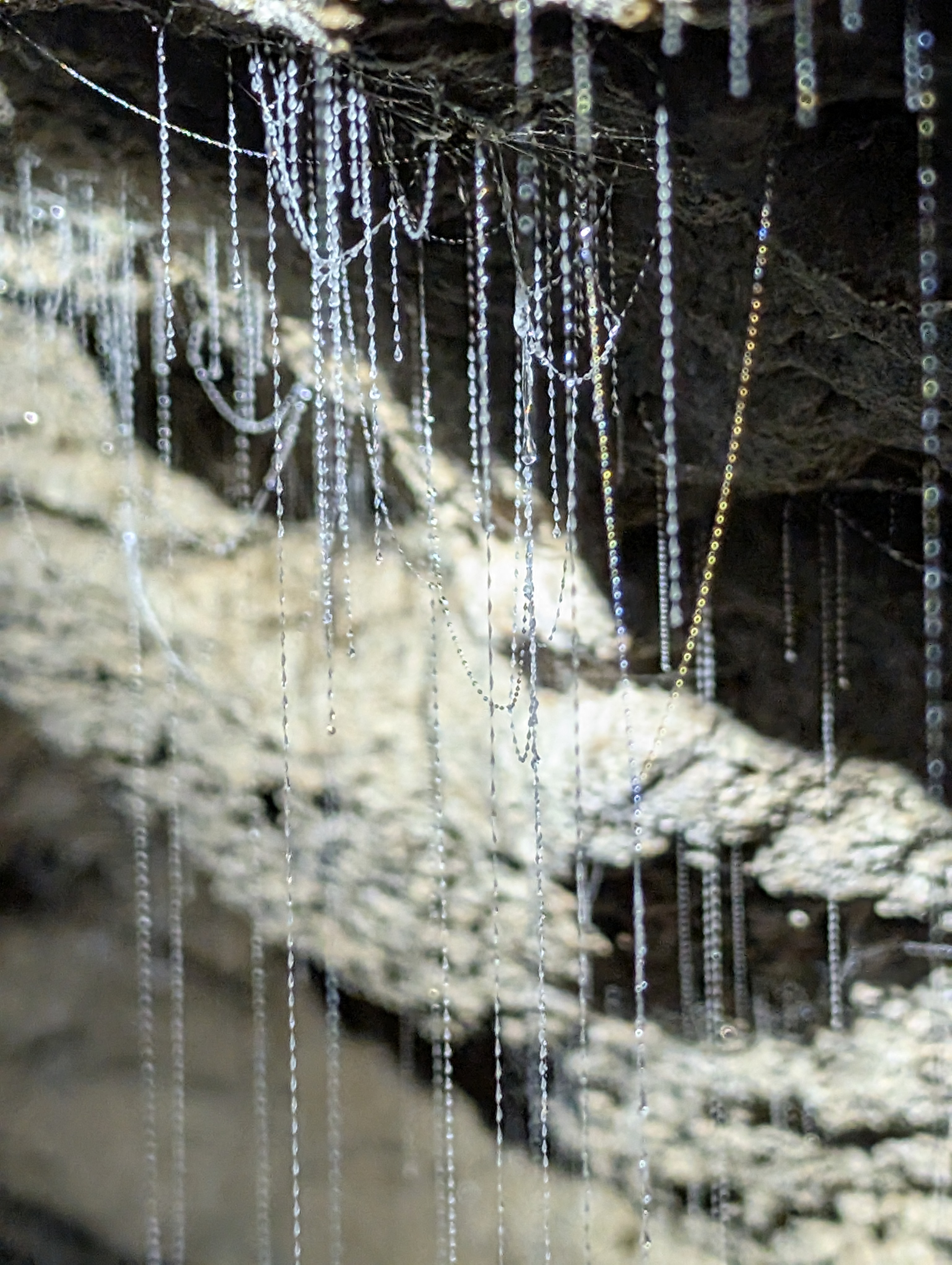 But the real high point was getting to see glow worms up close, in the light. You see, the “worms” are actually fly larvae that pick a niche in the rock, exude a long beaded string of sticky worm spit, then emit a faint green glow to attract small flying insects. When the insects get stuck in the string, the larva slurps it up, has a nice snack, and starts over.