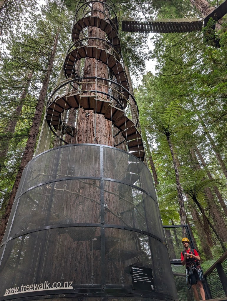We began the morning with a gentle stroll through Rotorua’s expansive and mature redwood forest. Wait – “mature”? Aren’t redwoods non-native?!? Full marks. They were planted here only about 125 years ago as an experiment, but something about the local climate and soil made them grow about 5-10 times faster than they do in their native soil. As a result, they’ve reached what looks like maturity in a mere century, but the growth spurt means that their wood isn’t dense enough to be commercially interesting. Which is, in fact, what has saved them from being logged for timber.