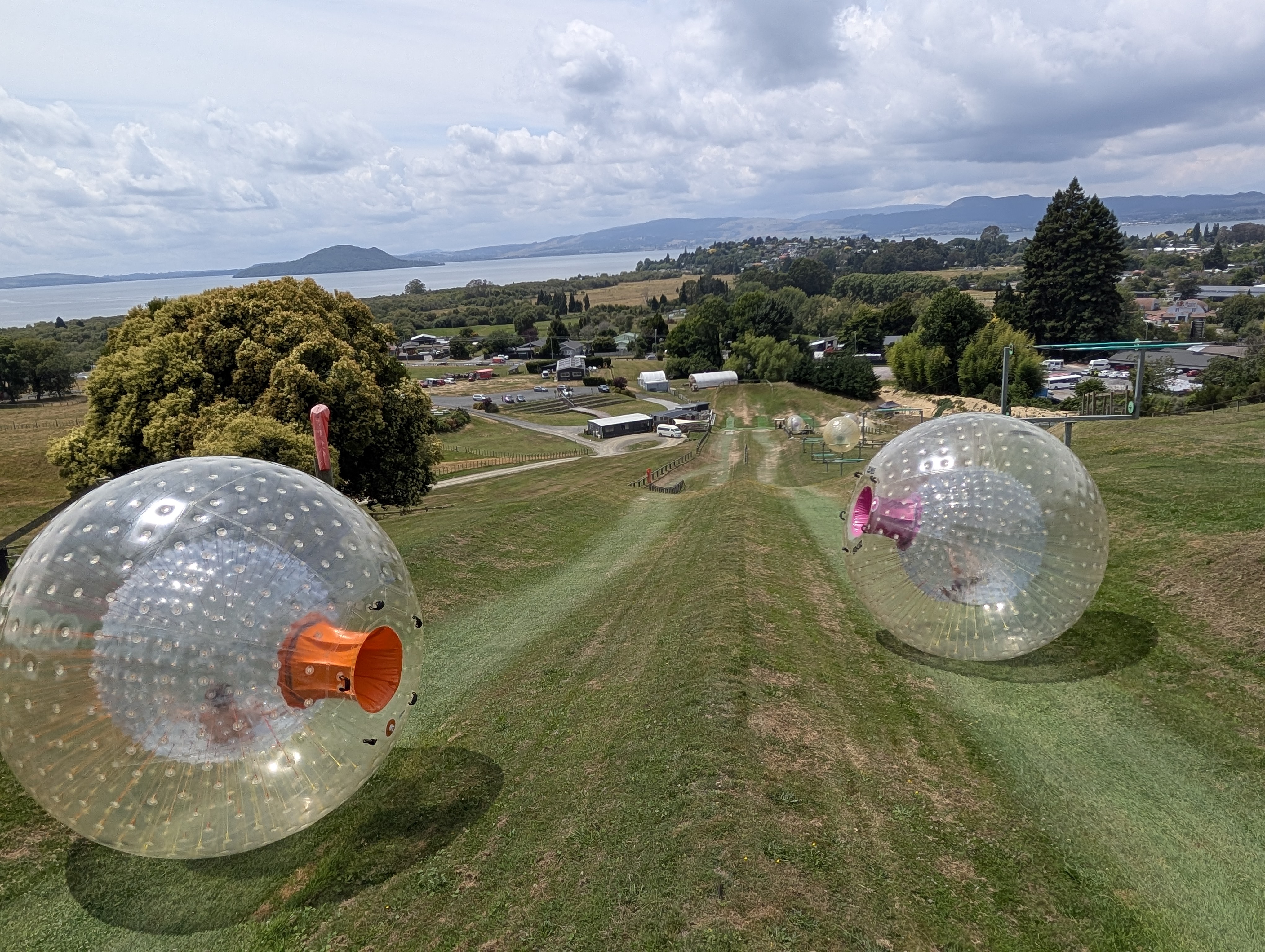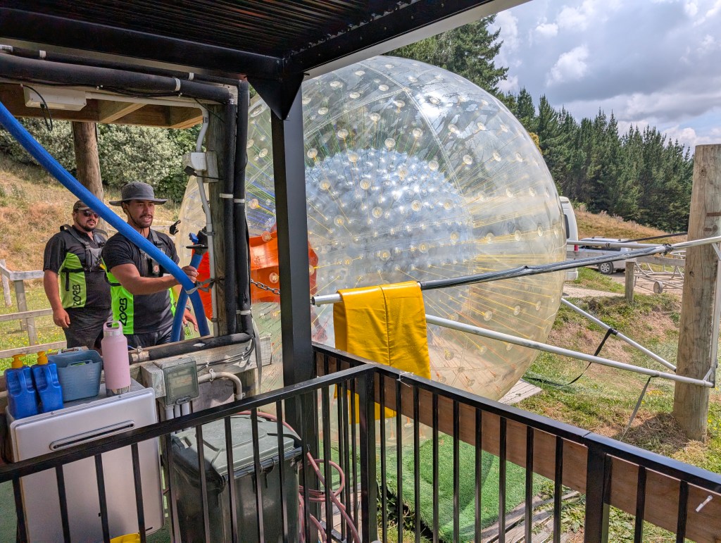 Then? Couldn’t leave Rotorua without trying the Zorbs. The what? Okay, take an enormous beach ball and suspend another beach ball inside it. Put a little hatch in that allows you to get to the middle and slosh it about 1/4 full of water. Wait – why? Put a human, or two or three inside and seal it up. I’m not following you. Then roll it downhill along an obstacle course that has it bounce all the heck over the place. Again: wait – why?!? Take them all back up the hill and repeat as necessary. Shakes head. Get a bit bored and build a whole ski-area like park with different “runs” and a lift and warming hut.
