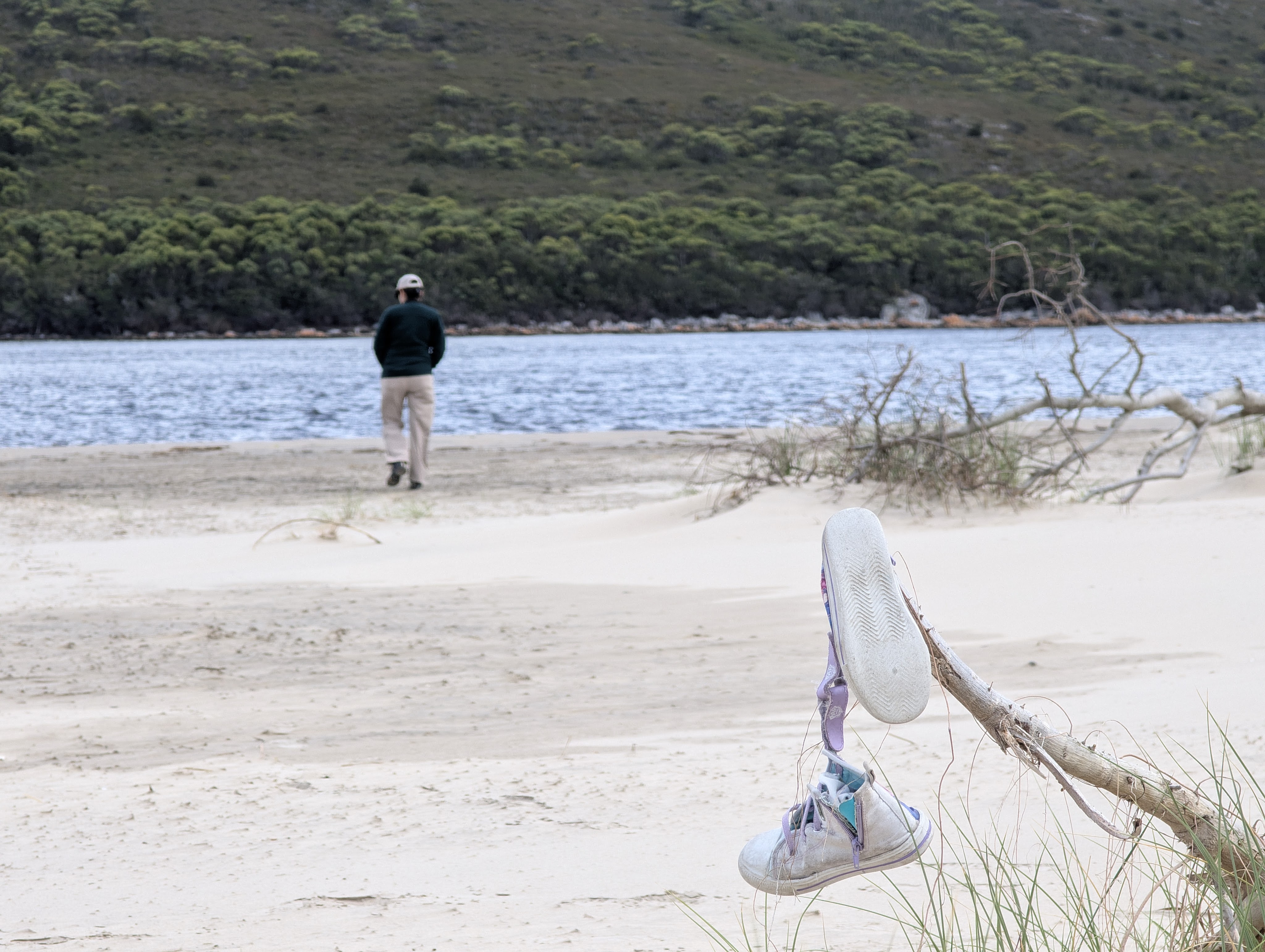The drive west was lovely, if a bit rainy and smokey, and by the time we reached the western terminus of the river and bay at Macquarie Head, rain and smoke had both cleared to give us a mottled blue/gray sky spilling out from the fine sand beach into the south Indian Ocean.
