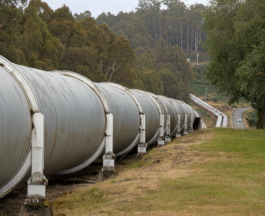 About an hour past the turnoff from the park we came to a pair of absolutely massive steel pipes stretching out to the horizon and following a side road with a sign that said “Tarraleah Estates – restaurant, cabins, camping, golf.” The next “official” campground was still another hour off; I was ready for dinner, and Devon was ready to be done for the day. Besides – those pipes.