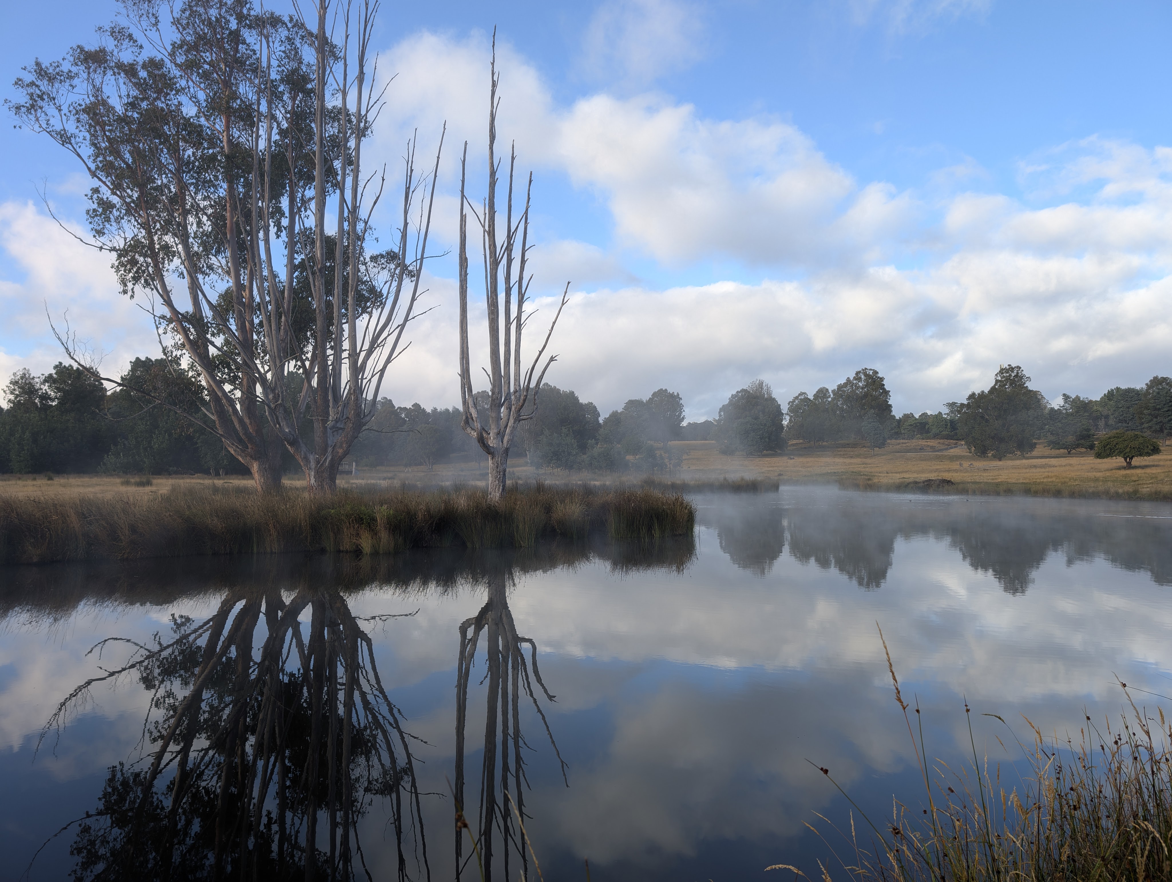 There was frost on the windshield first thing in the morning. But by the time D and I had managed ourselves upright, dressed and primed with tea and hot cocoa respectively, the low sun had already begun to steam heat into the land. Half a dozen wallabies hopped, nibbled, hopped, nibbled the lawn around us. (There was practically a perimeter of wallaby poop close around the van, making it hard to avoid the inference that we’d been cased during the night).