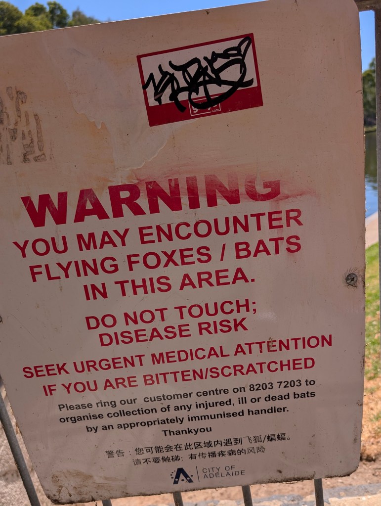 But the most enduring impression I have of Adelaide is one of winged peril. Throughout the city I kept encountering signs that warned swooping magpie larks, aggressive pelicans, masked lapwings and (drum roll, please) giant fruit bats – what to watch out for and how to respond if attacked by one. I kid you not.