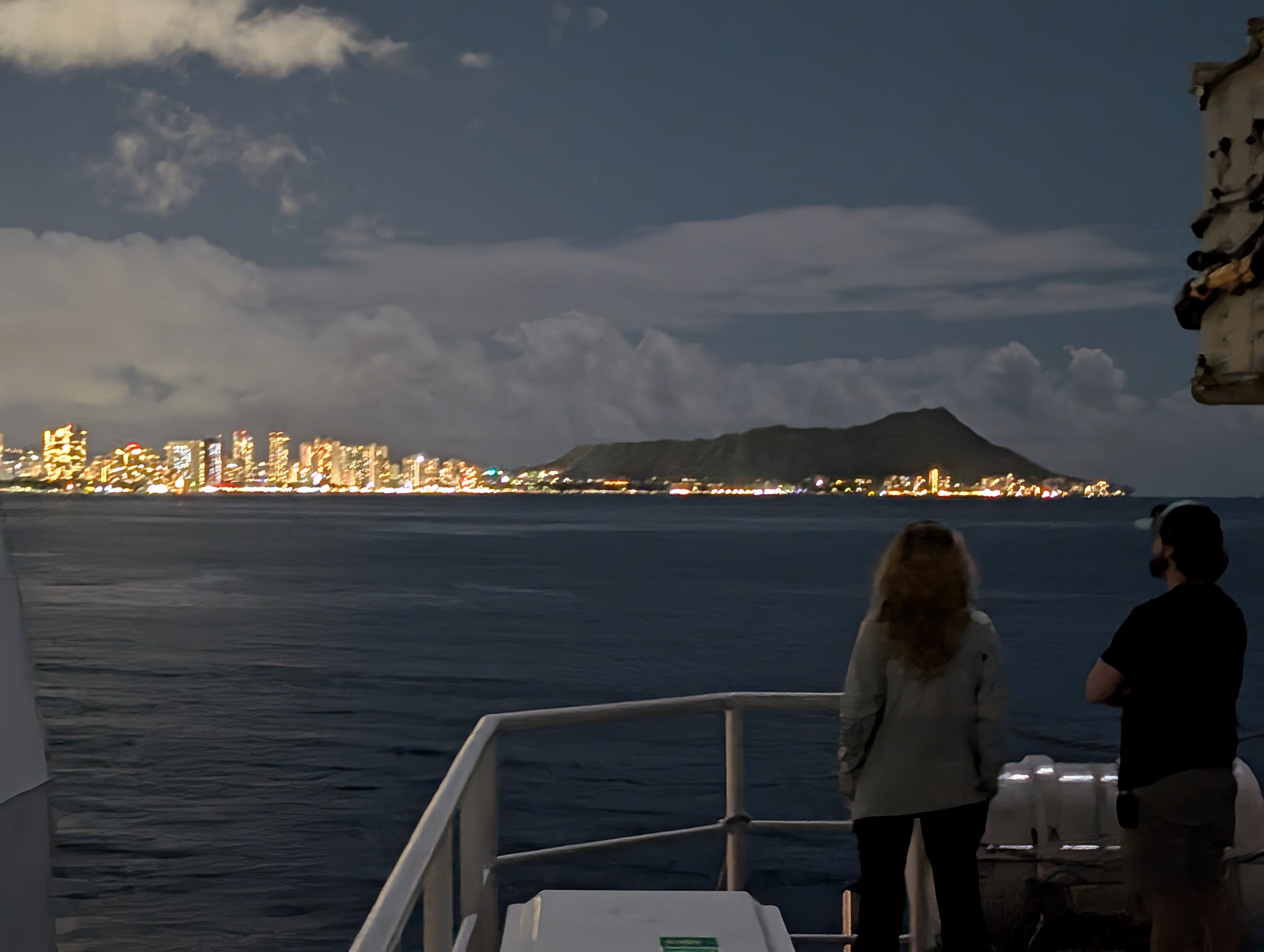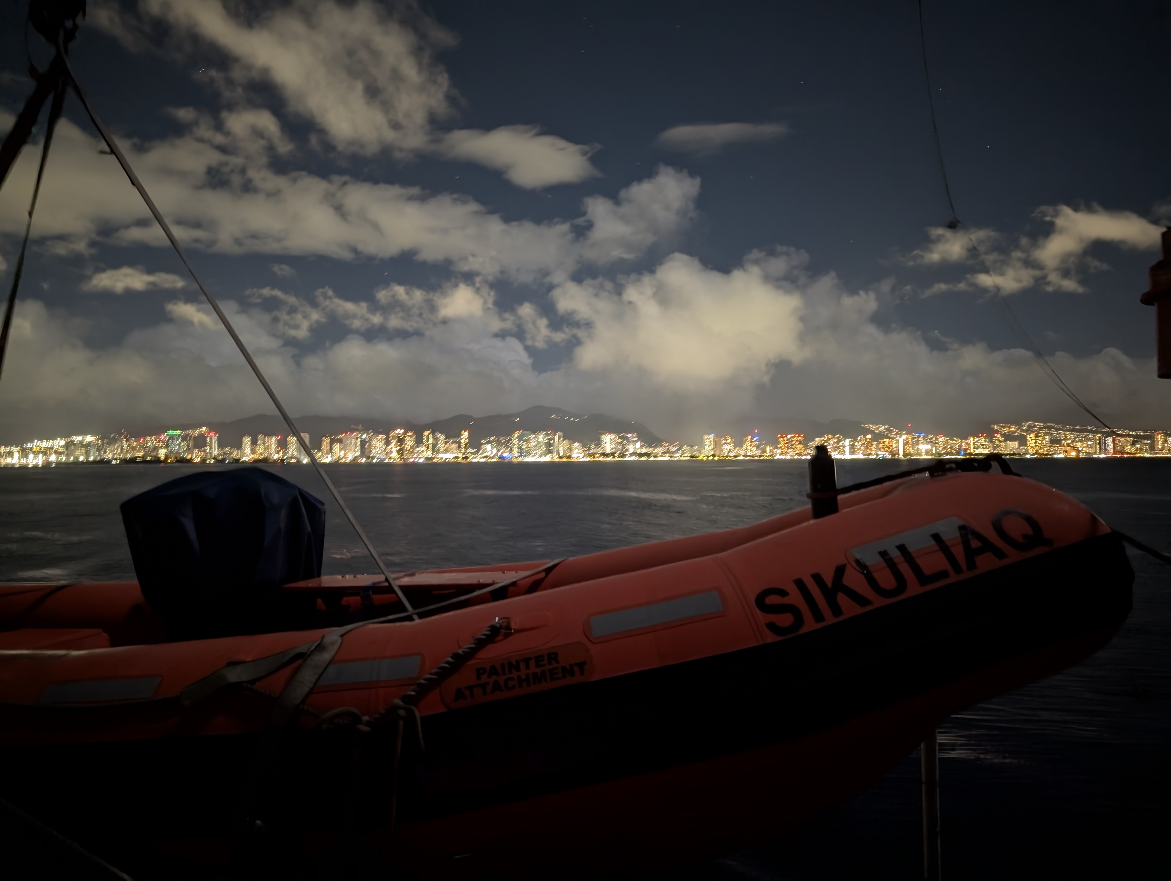 We’re coming around the south end of Oahu, eastbound, and turning north by northeast from there. The equatorial current wants to push us west, so we’re going to run perpendicular rather than fighting it, jinking north to catch the currents that will carry us east to Alaska. Ten or eleven days at sea – half a dozen “instructors,” a few more “students” than that, and then the rest of us who fit somewhere in between, or not at all. We’ve not even gotten to the point of trying to remember everyone’s names. Just the reminders to make sure you’ve secured your gear, and don’t get behind on your seasickness meds.