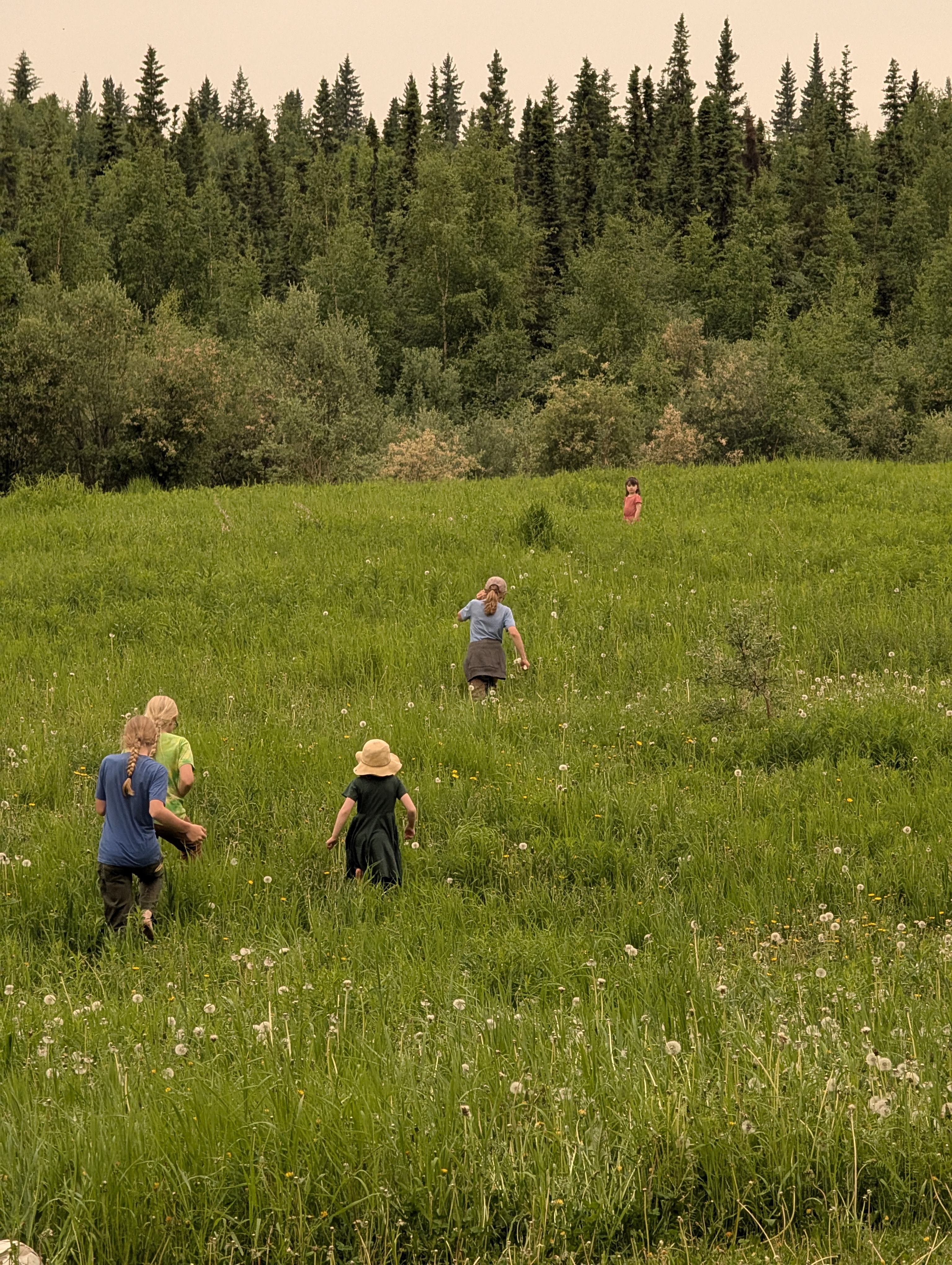 Oh, except the kids. There was a constant dust-devil of free-range kids of all ages swirling through the place, chasing each other, climbing each other and anything else that stood still and looked like it could bear their weight for more than a moment. Launching off down the road, or into the deep grass of the back pasture. Pausing to circle and comfort the littler ones when they fell afoul of the natural obstacles, or each other.