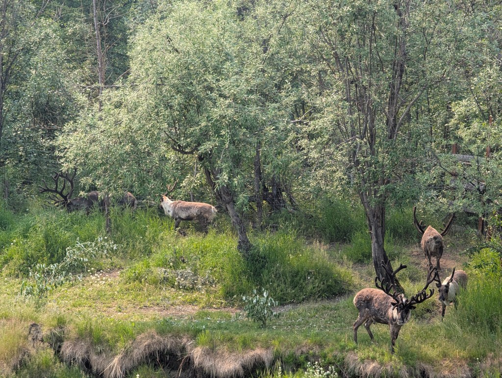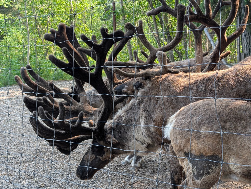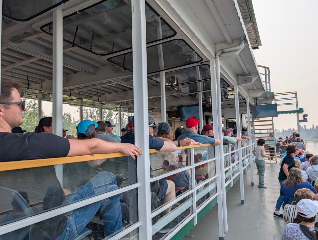 We filtered out some time after 1:00, with the music still going strong, to head down to the river for our Obligatory Riverboat Tourist Activity. Which was every bit as touristy as expected, but still a delightful way to spend an afternoon. Staged riverside activities – a (different) Super Cub taking off and landing beside the boat on floats, a pause by the famed kennels of the late Iditarod legend Susan Butcher for a mushing demonstration. Caribou grazing and a quick – still riverside – demonstration of Athabascan salmon drying techniques. Plus reindeer chili and hot dogs on board and samplers of the company’s own canned salmon. Cheesy (literally – the salmon spread was a 2-to-1 mix with cream cheese) but, as I said, still a delightful way to spend the afternoon.