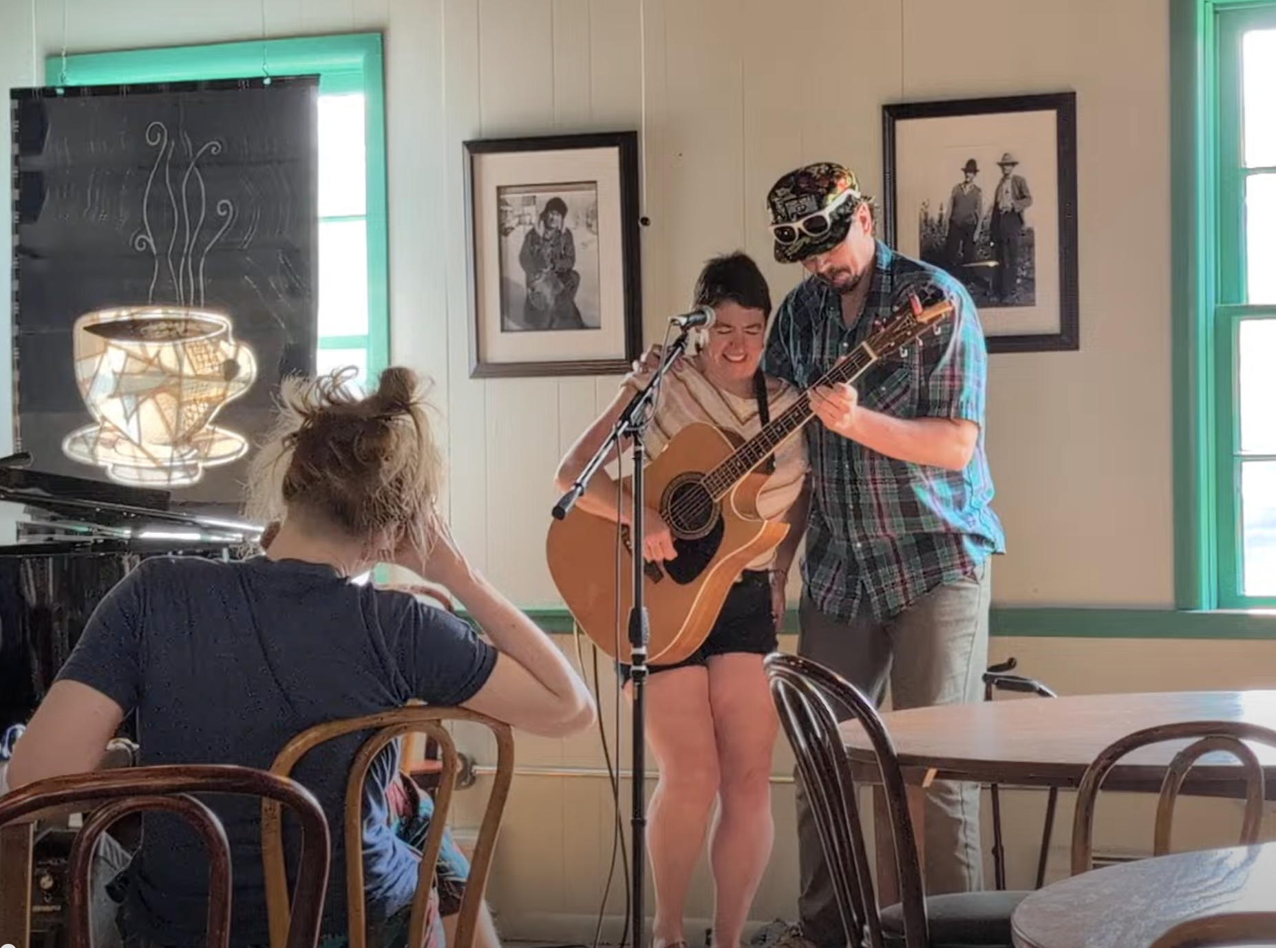 Finding surprisingly little promise of coffee where we were staying, we hopped in the car and drove back to the west edge of town. We’d been told that Flossie & May’s, across from the Malemute, was the place to be for breakfast, and it was. Kat Moore, keyboard player for last night’s headliner, was spinning tunes at piano and guitar, and by the time we’d finished our coffee and baked nibbles, it felt like half the musicians from the jamboree had filtered in to caffeinate, sing along, and maybe sit in for a tune or two.
