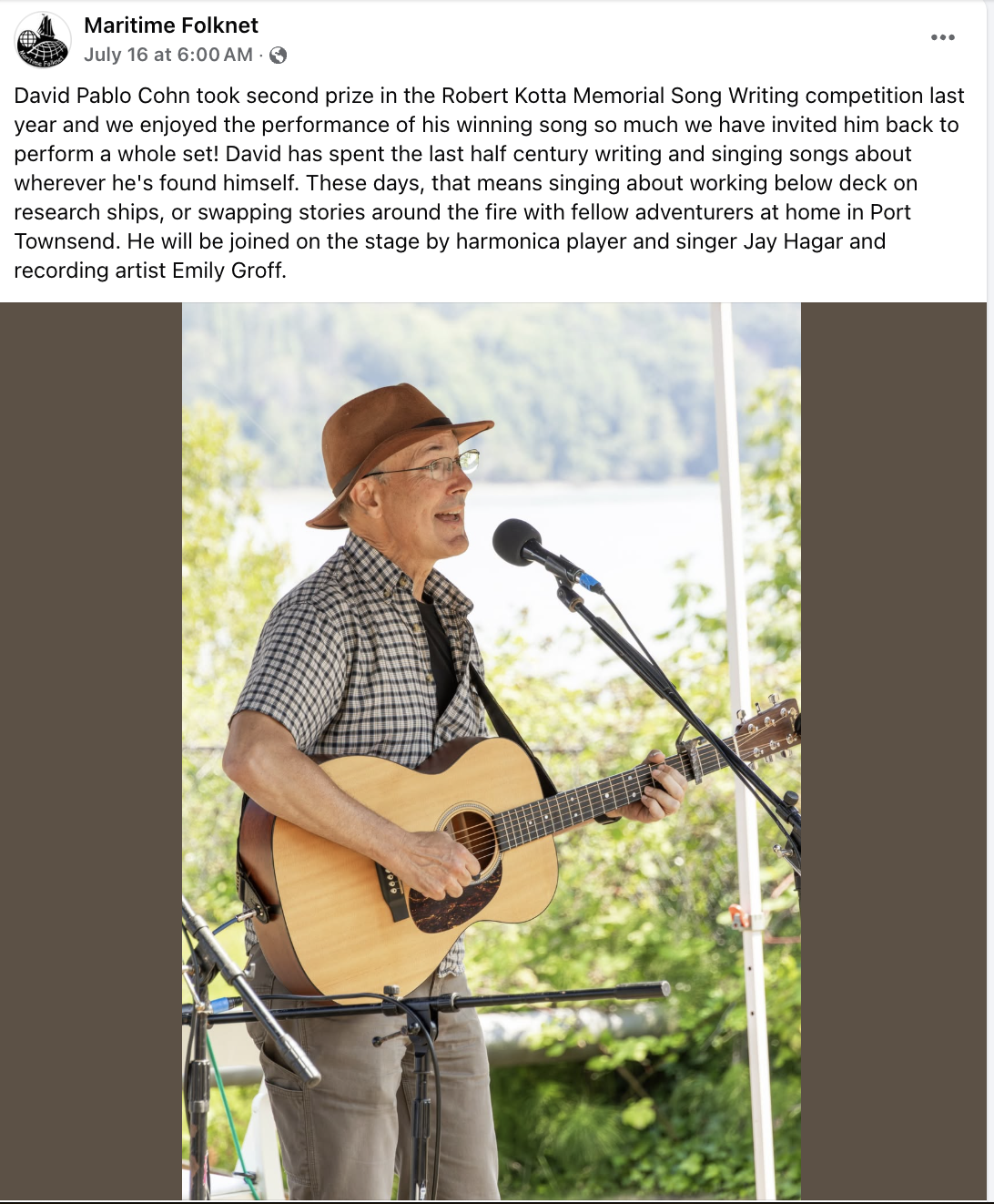 Then (catches breath) the next weekend at the Port Townsend Wooden Boat Festival, sharing a set of new and original maritime songs with Brian Ledford at noon on Saturday, Sept 6th.