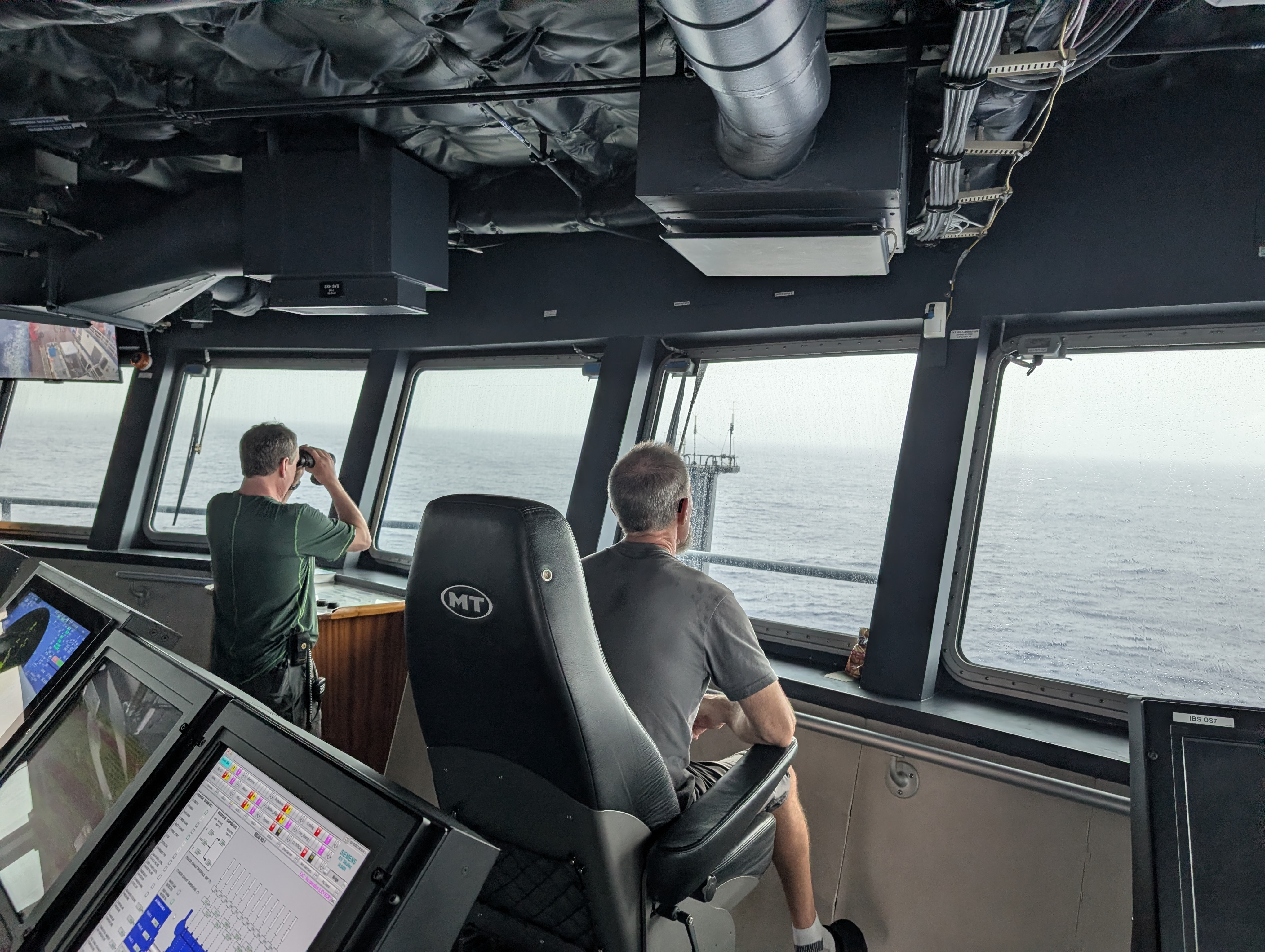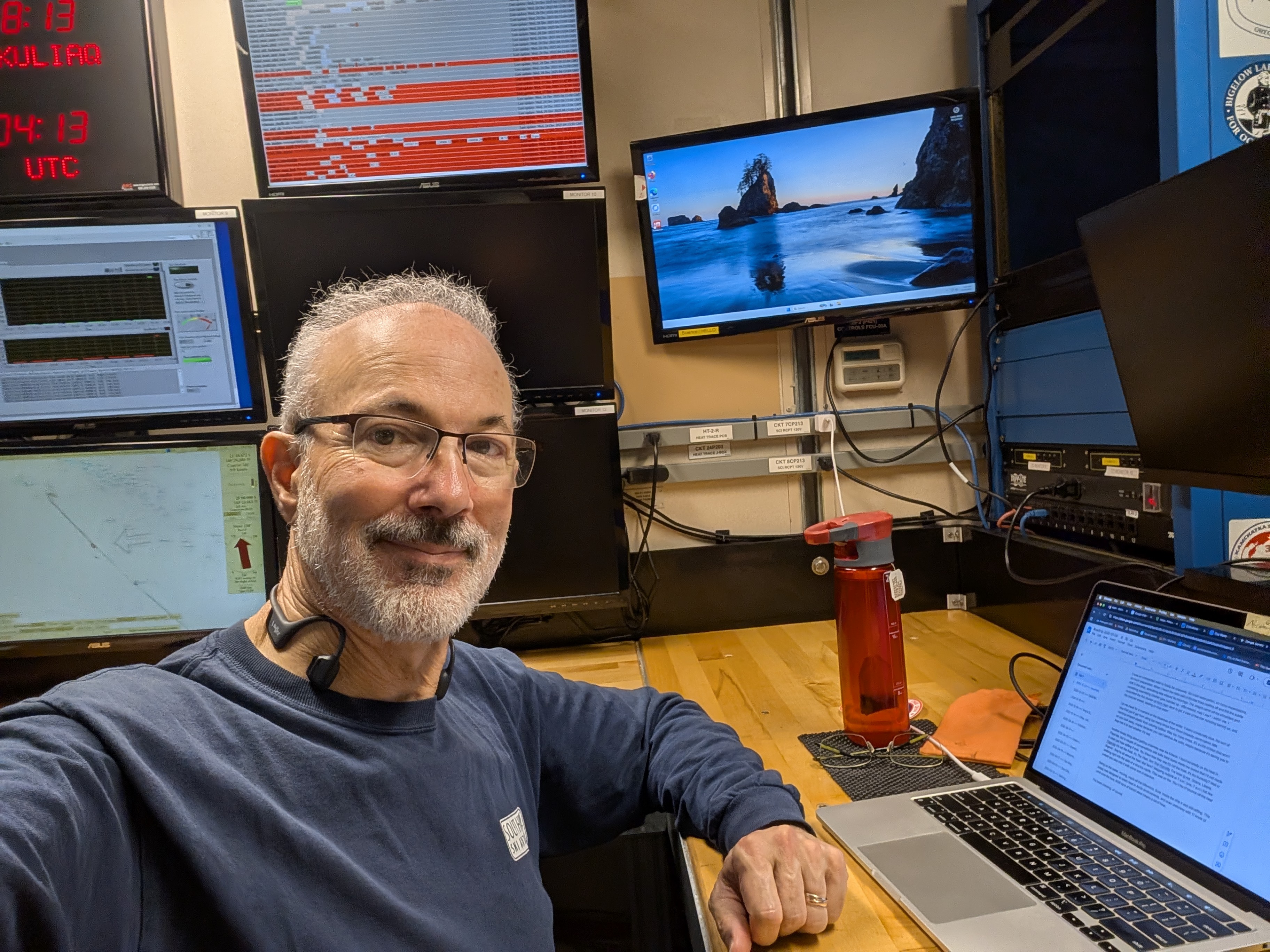 I’ve been cheating, of course. While most folks on board have specific work areas, like the engine room or bridge or back deck, wifi covers the whole ship, so I can work wherever is most convenient. Like in the refrigerated server room, for example. The problem there is that it’s actually too cold, so I’ve been bundling up there until I’m overly chilled (30 minutes), then pop out to main lab to get back up to “overly warm,” and repeat as necessary.