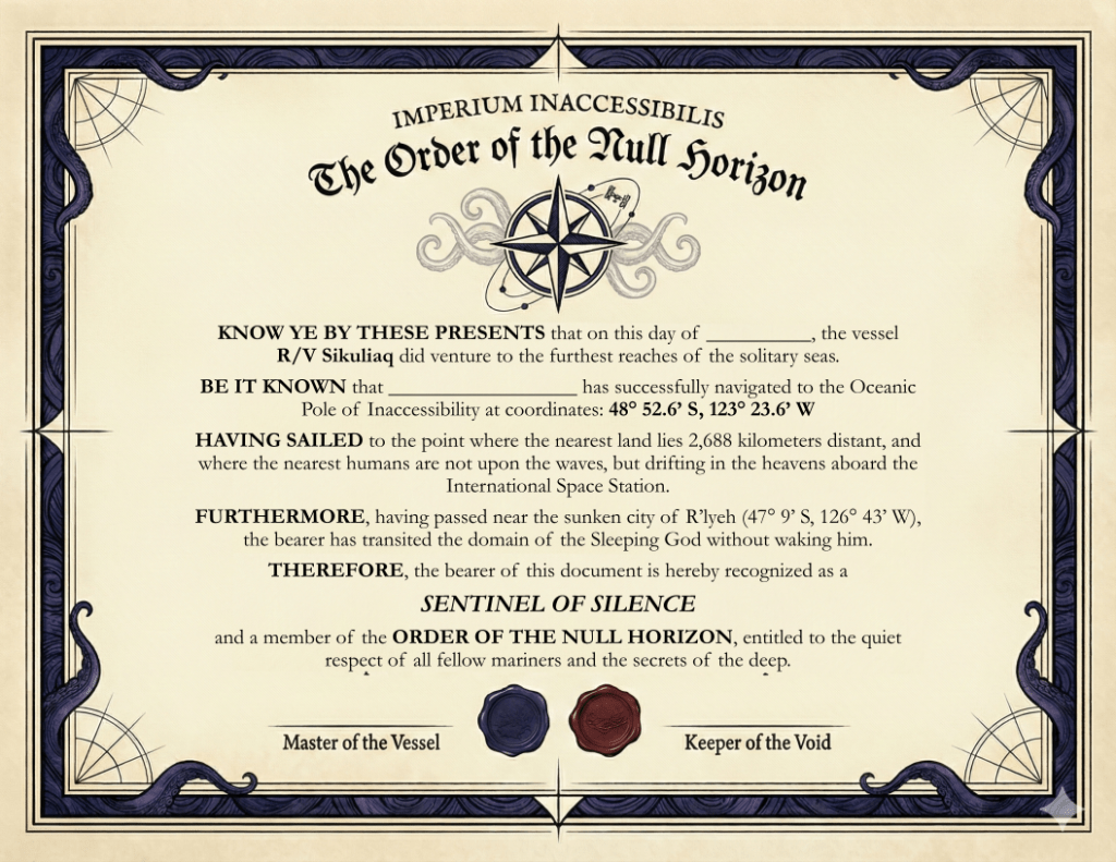 Plans, obviously, immediately slammed into gear for a “ship-to-ship” radio call between the most remote humans on/above earth. Mariners claim bragging rights, with fancy certificates to boot, for various nautical transits: “Shellbacks” for crossing the equator, “Blue nose” for the Arctic Circle, “Golden Dragon” for the International Date Line, etc. Well, this particular nerd (Shellback, Red Nose, Golden Dragon, if you’re asking), took it upon himself to find what certificate and ritual existed for a Point Nemo transit. And…there didn’t appear to be one.