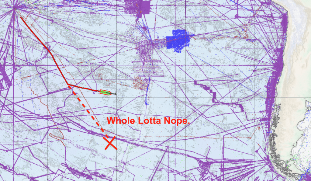 So instead of bragging rights, we’re having a smooth ride, planning to make Punta Arenas on time, and getting our various bits of maintenance, science, etc. done. Spending time on the bridge watching the sea, getting to know everyone better – favorite movies, improbable connections of No, really, you two used to date?!?.