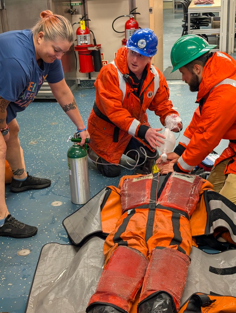 (I’m sorry to report that, in spite of the crew’s best efforts at CPR, oxygen and AED application, we were unable to get a pulse out of Oscar post-recovery. He was returned to duty at his station in the wet gear locker, but I have no doubt that he’ll revive and return to duty, ready to slip overboard again at the right time.)